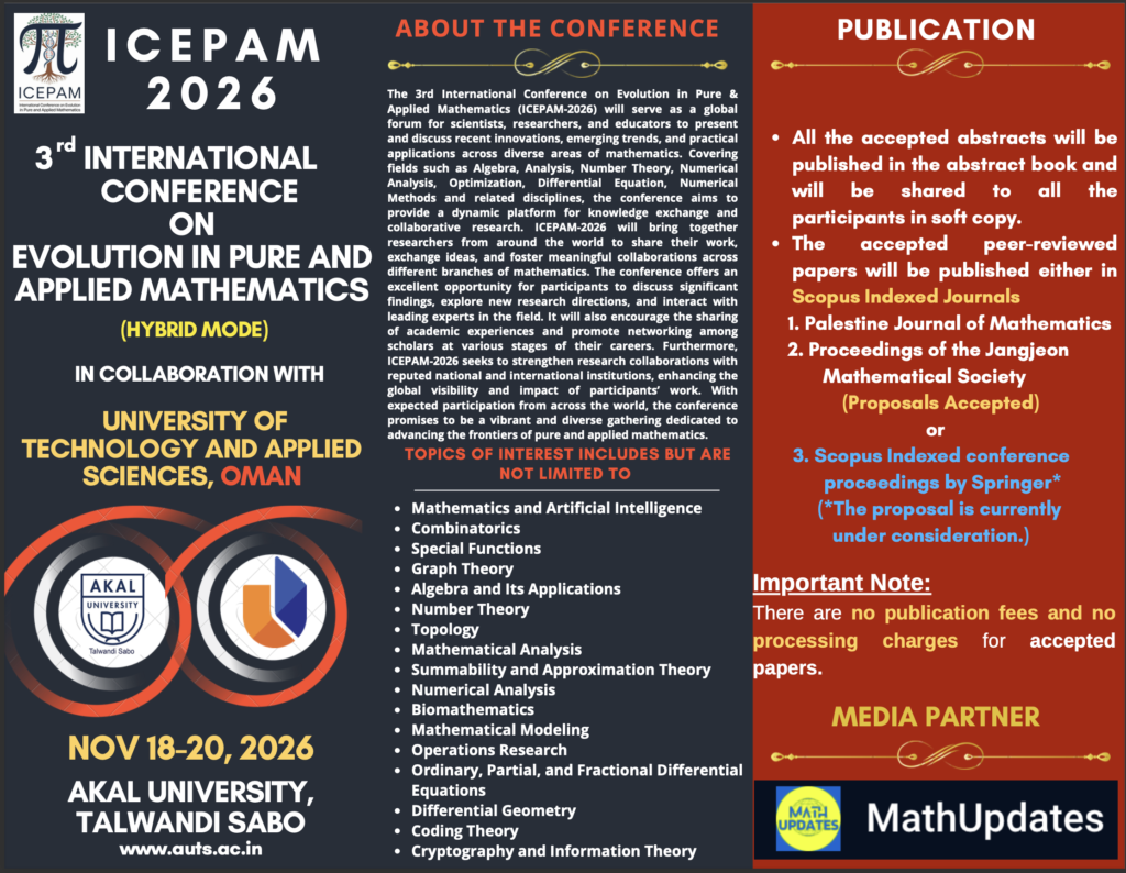 The 3rd International Conference on Evolution in Pure & Applied Mathematics (ICEPAM 2026) will serve as a global forum for scientists, researchers, and educators to present and discuss recent innovations, emerging trends,and practical applications across diverse areas of mathematics. Covering fields such as Algebra, Analysis, Number Theory, Numerical Analysis, Optimization, and related disciplines, the conference aims to provide a dynamic platform for knowledge exchange and collaborative research. ICEPAM-2026 will bring together researchers from around the world to share their work, exchange ideas, and foster meaningful collaborations across different branches of mathematics. The conference offers an excellent opportunity for participants to discuss significant findings, explore new research directions, and interact with leading experts in the field. It will also encourage the sharing of academic experiences and promote networking among scholars at various stages of their careers. Furthermore, ICEPAM-2026 seeks to strengthen research collaborations with reputed national and international institutions, enhancing the global visibility and impact of participants’ work. With expected participation from across the world, the conference promises to be a vibrant and diverse gathering dedicated to advancing the frontiers of pure and applied mathematics.